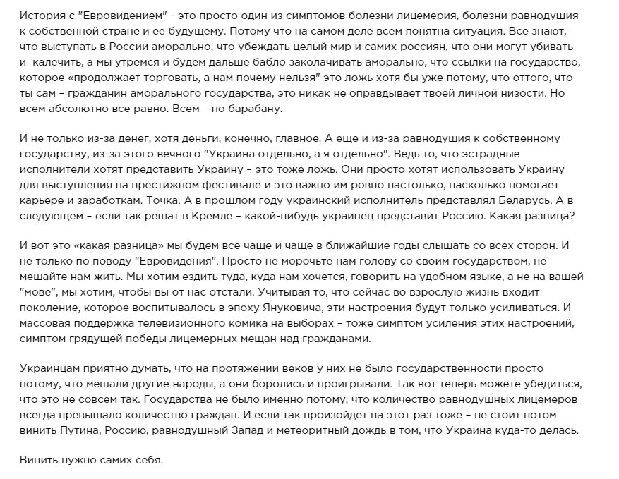 "И не только из-за денег, хотя деньги, конечно, главное. А еще и из-за равнодушия к собственному государству, из-за этого вечного "Украина отдельно, а я отдельно". Ведь то, что эстрадные исполнители хотят представить Украину – это тоже ложь. Они просто хотят использовать Украину для выступления на престижном фестивале и это важно им ровно настолько, насколько помогает карьере и заработкам. Точка", - добавил он.