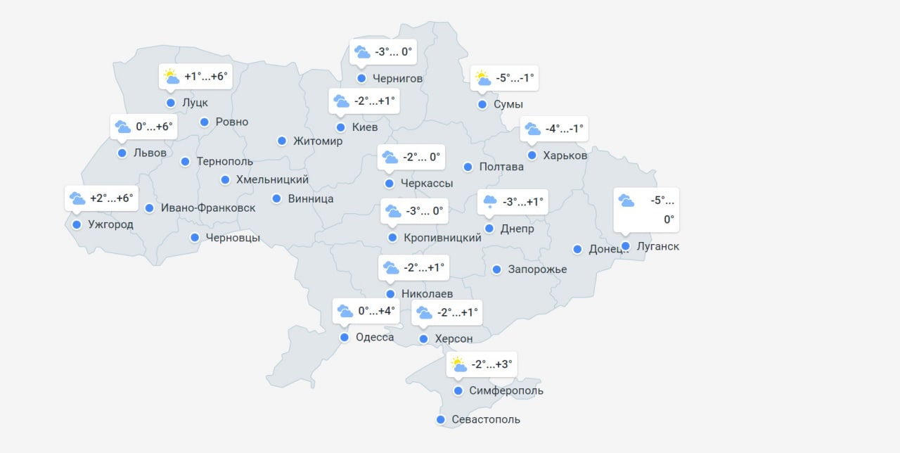 Прояснения, как говорится в прогнозе погоды, возможны в Ивано-Франковской, Волынской, Хмельницкой, Черновицкой, Сумской и Херсонской областях, а также в Крыму. Более того, на территории всей Украины осадков не предвидится, за исключением Днепропетровской и Запорожской областей, где возможен мокрый снег с дождем.