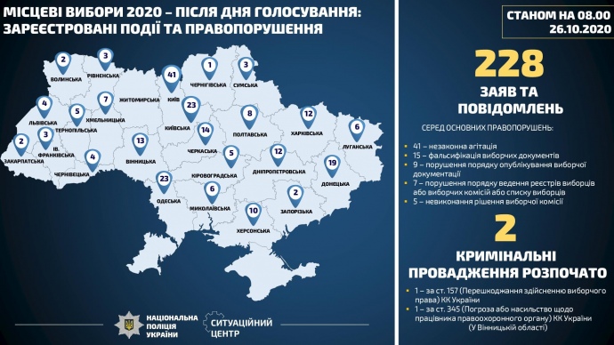 По информации МВД, по состоянию на утро 26 октября к правоохранителям поступило более 5000 обращений о нарушениях на выборах, зарегистрировали - 159 уголовных производств.