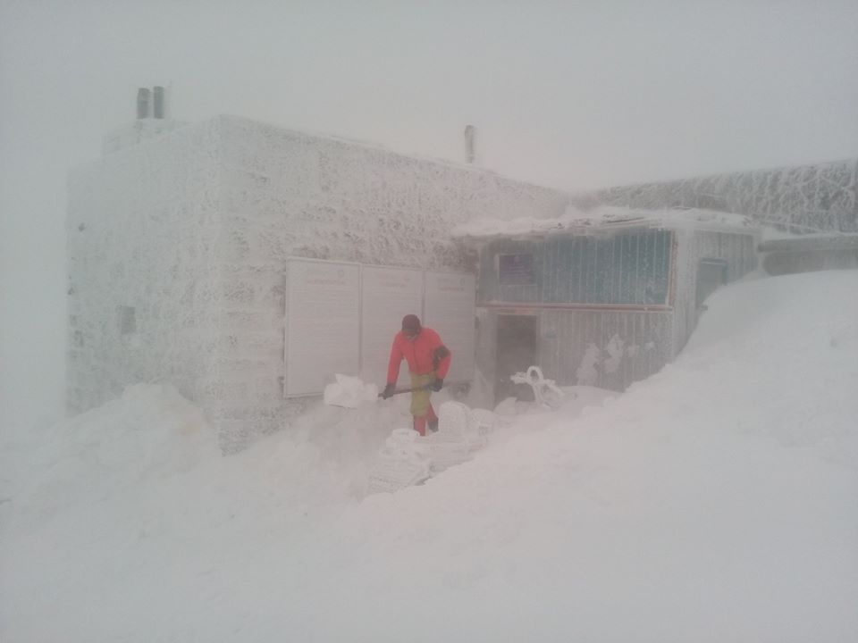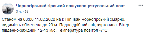 "По состоянию на 8:00 11.02.2020 на г. Поп Иван Черногорский облачно, видимость ограничена до 20 м. Падает мелкий снег, метель. Ветер юго-западный 12-13 м /с. Температура воздуха -7°С", - говорится в сообщении.