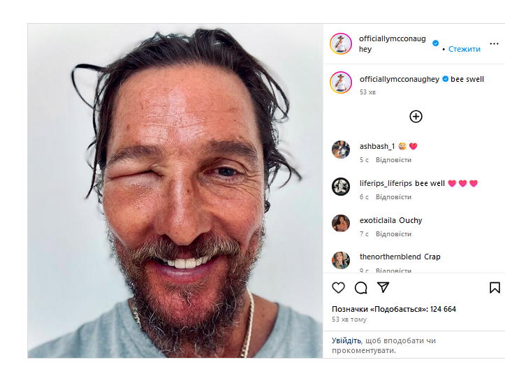 Напомним, что недавно Мэтью Макконахи в лицо укусила пчела. Фото он опубликовал 10 июля в своем Инстаграмме.