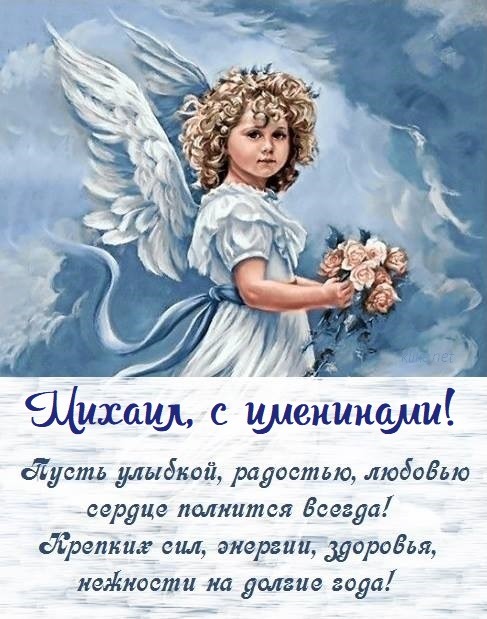 Я поздравляю тебя, Михаил, с радостным и светлым днем, с днем твоего ангела-хранителя! Пусть ангел всегда тебя оберегает от бед и завистливых глаз, да будет твоя душа всегда наполнена большой любовью и счастьем.