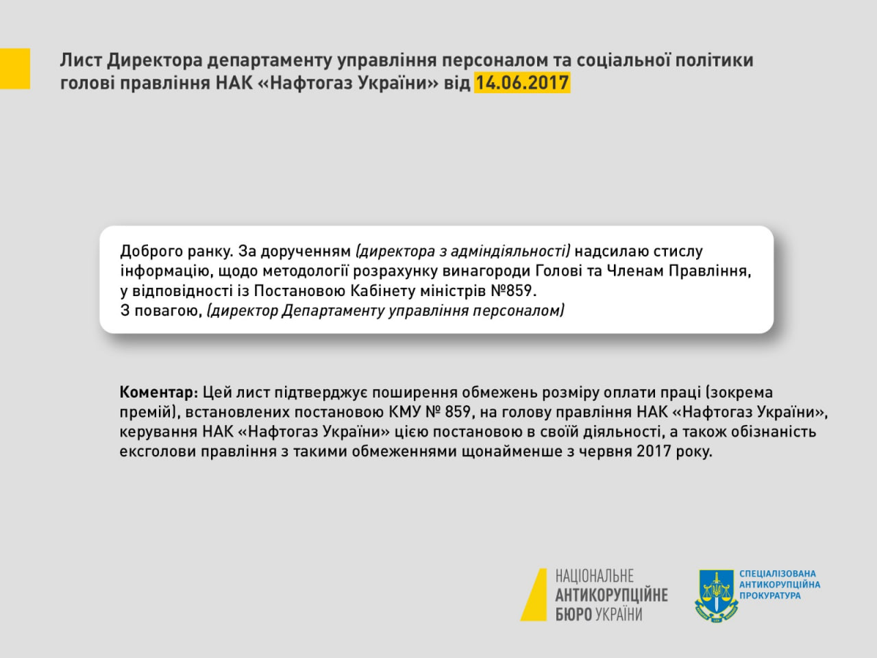 Опубликованные НАБУ материалы являются перепиской от 14 июня 2017 г. директора департамента управления персоналом и соцполитики и Андрея Коболева, в котором последний получил методологию расчета премий.