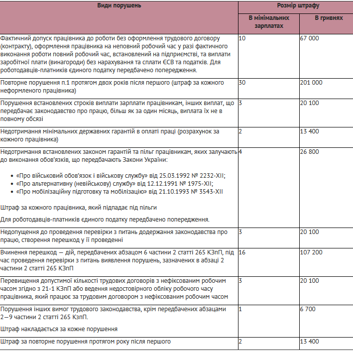 В частности, наказывается фактический допуск работника к работе без оформления трудового договора, оформление на неполное рабочее время за по факту полное рабочее время, выплаты зарплаты без начисления, уплаты ЕСВ и налогов. Штраф будет составлять 10 минимальных зарплат - 67 тыс. грн, при повторном нарушении - 30 минимальных зарплат.