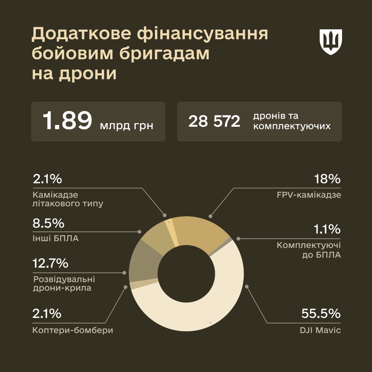 Министерство обороны Украины направило дополнительно в боевые бригады на закупку дронов 1.89 млрд грн.