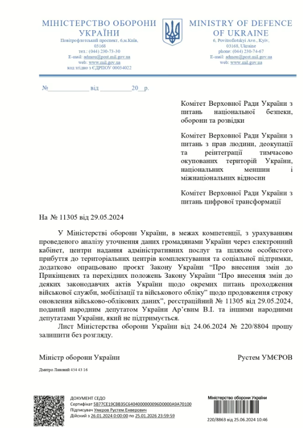 "В Министерстве обороны Украины, в пределах компетенции, с учетом проведенного анализа уточнения данных гражданами Украины через электронный кабинет, центры предоставления административных услуг и путем личного прибытия в территориальные центры комплектования и социальной поддержки, дополнительно проработан проект Закона Украины "О внесении изменений в некоторые законодательные акты Украины относительно отдельных вопросов прохождения военной службы, мобилизации и воинского учета" о продлении срока обновления военно-учетных данных", регистрационный № 11305 от 29.05.2024, поданный народным депутатом Украины Арьевым В.И. и другими народными депутатами Украины, который не поддерживается".