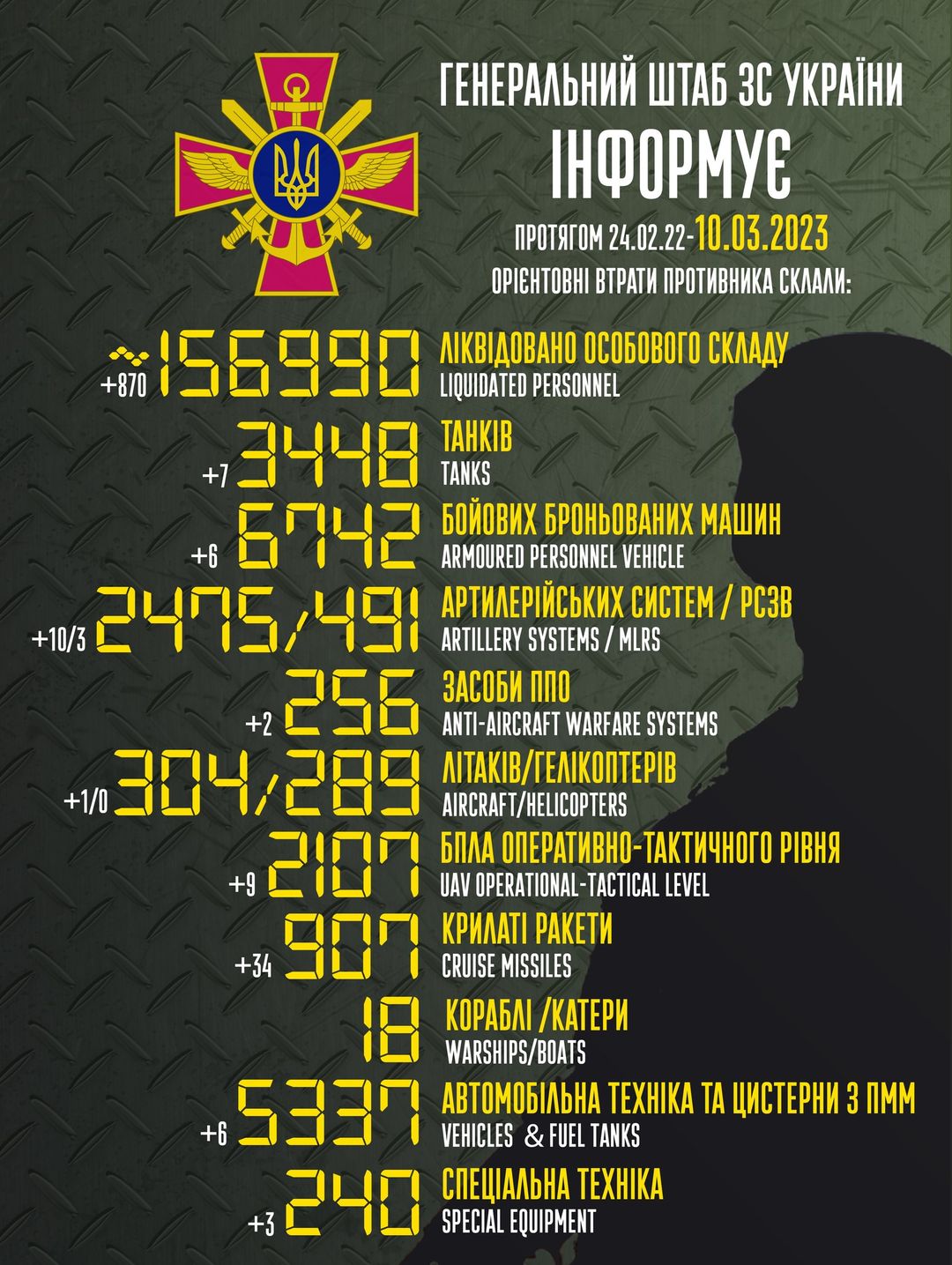 Об общих боевых потерях врага по состоянию на 10 марта сообщили в Генштабе ВСУ.