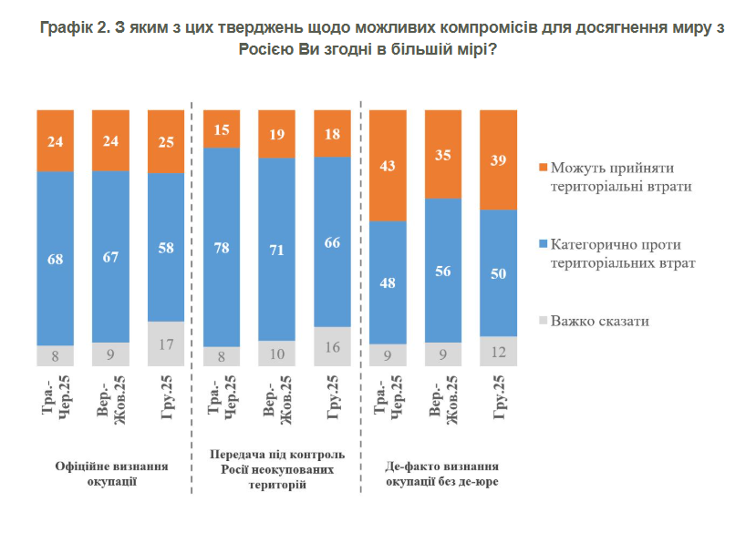 Отдельное внимание в опросе уделили интерпретации территориальных потерь. Если речь идет о юридических обязательствах, то «большинство (58%) будут против» официального признания оккупированных земель частью России (готовы принять – 25%). Еще большее сопротивление вызывает идея передать территории, которые сейчас контролируются Украиной, такие как Херсон или Запорожье — такое предложение отвергают 66% респондентов (готовы принять — только 18%).