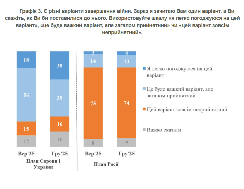 Большинство граждан Украины выражают готовность поддержать сценарий завершения войны, предусматривающий получение западных гарантий безопасности и прекращение боевых действий на нынешней линии фронта при условии отсутствия официальных уступок территориями. В то же время подавляющая часть общества категорически отвергает российские условия мира, включающие ограничение армии, отказ от НАТО и юридическое признание оккупации регионов.