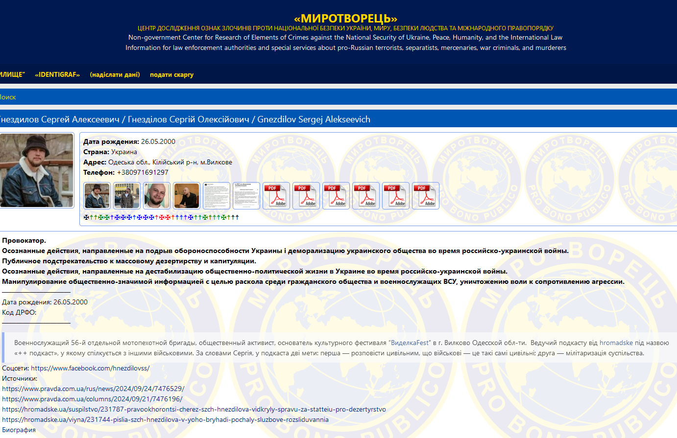 "Провокатор. Осознанные действия, направленные на подрыв обороноспособности Украины и деморализацию украинского общества во время российско-украинской войны. Публичное подстрекательство к массовому дезертирству и капитуляции. Осознанные действия, направленные на дестабилизацию общественно-политической жизни в Украине во времена российско-украинской войны. Манипулирование общественно-значимой информацией в целях раскола среди гражданского общества и военнослужащих ВСУ, уничтожения воли к сопротивлению агрессии" , - говорится на портале.