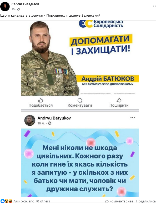На это отреагировал военный и член партии "Европейская солидарность" Александр Погребиский. Он отметил, что вышел на связь с Андреем, где тот заявил, что его сообщение подхватили в сети и привязали к тому, что якобы является членом политической партии Порошенко, в то время как эта информация не соответствует действительности.