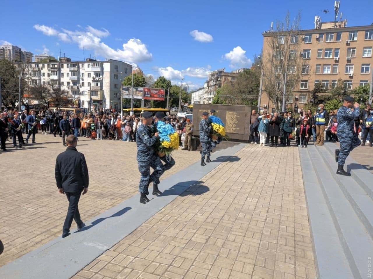 Сотни горожан пришли к памятнику Неизвестному матросу в парке Шевченко, стеле "Крылья победы" на площади 10 Апреля на мемориал 411-й береговой батареи, чтобы возложить цветы.