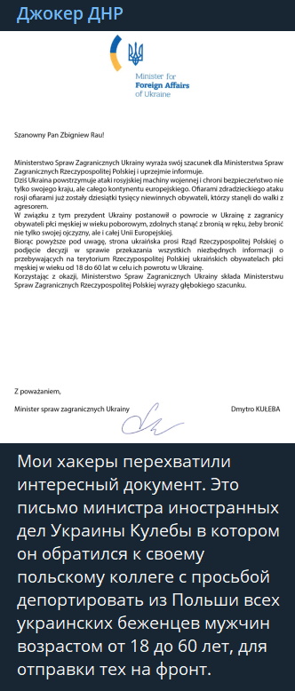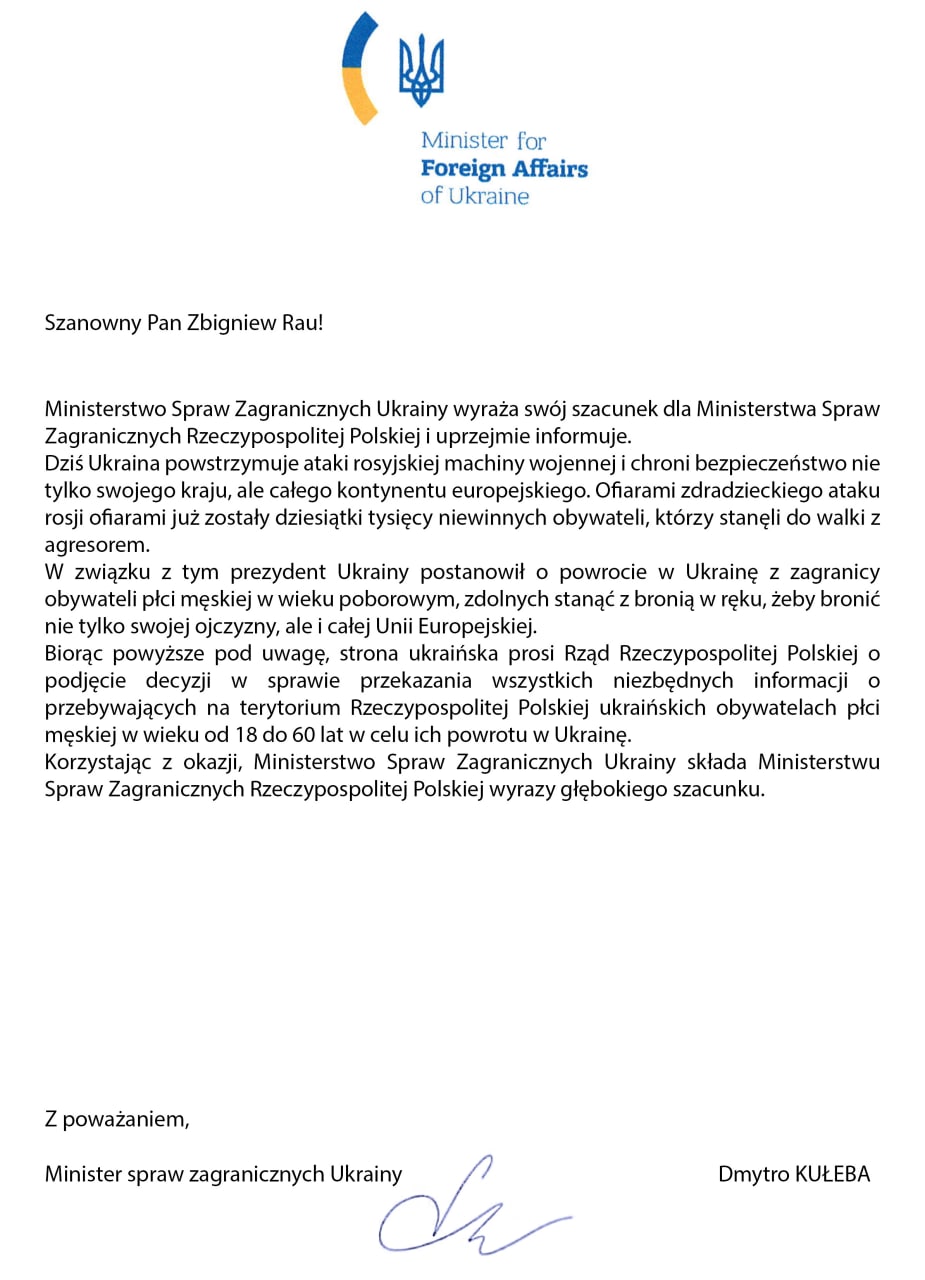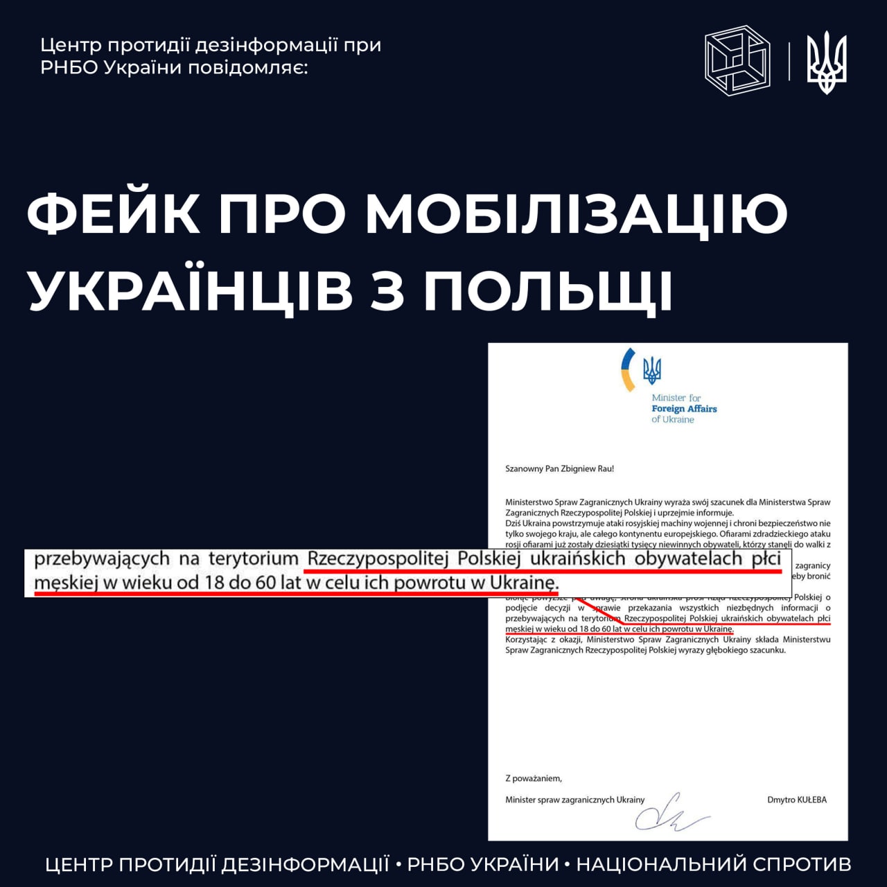 Правительственный центр безопасности Республики Польша обнаружил фейковое письмо в Министерство иностранных дел Польши - оно якобы поступило от Министерства иностранных дел Украины. В письме говорится о просьбе предоставить Украине информацию обо всех мужчинах-украинцах в возрасте до 60 лет, которые находятся в Польше.