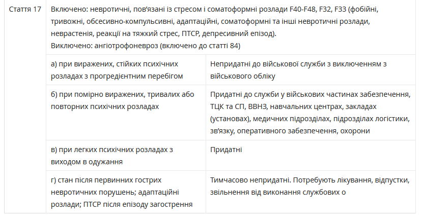 "К пункту "а" относятся ПТСР с выраженной симптоматикой и прогредиентным типом течения, выраженное тревожно-депрессивное расстройство ассоциированное со стрессом, выраженное генерализованное тревожное расстройство, выраженное обсессивно-компульсивное расстройство, тяжелый депрессивный эпизод без психотических симптомов депрессивные эпизоды, осложненные суицидальными попытками, суицидальными намерениями, не поддающимися лечению аутоагрессивным поведением с продолжительностью болезненных проявлений более 3 месяцев с момента возникновения клинических болезненных проявлений", - пояснили юристы.
