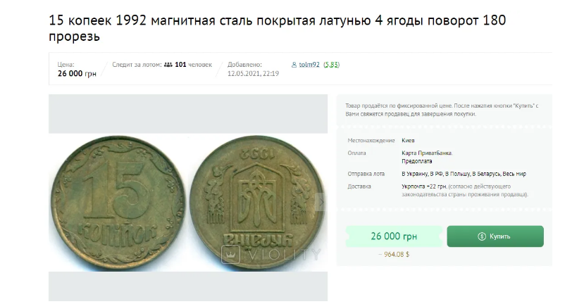 В Украине монету в 15 копеек продают на аукционе почти за тысячу долларов. За нее просят 26 тысяч гривен.