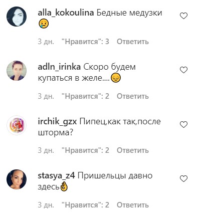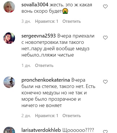"Бедные медузки", "Скоро будем купаться в желе....", "Жесть. это ж какая вонь скоро будет", "Вчера были на степке, такого нет. Есть конечно медузы но не так и море было прозрачное и ничего не воняет", "Это на пляжах которые не убираются, хотя не приятно", - пишут в комментариях.