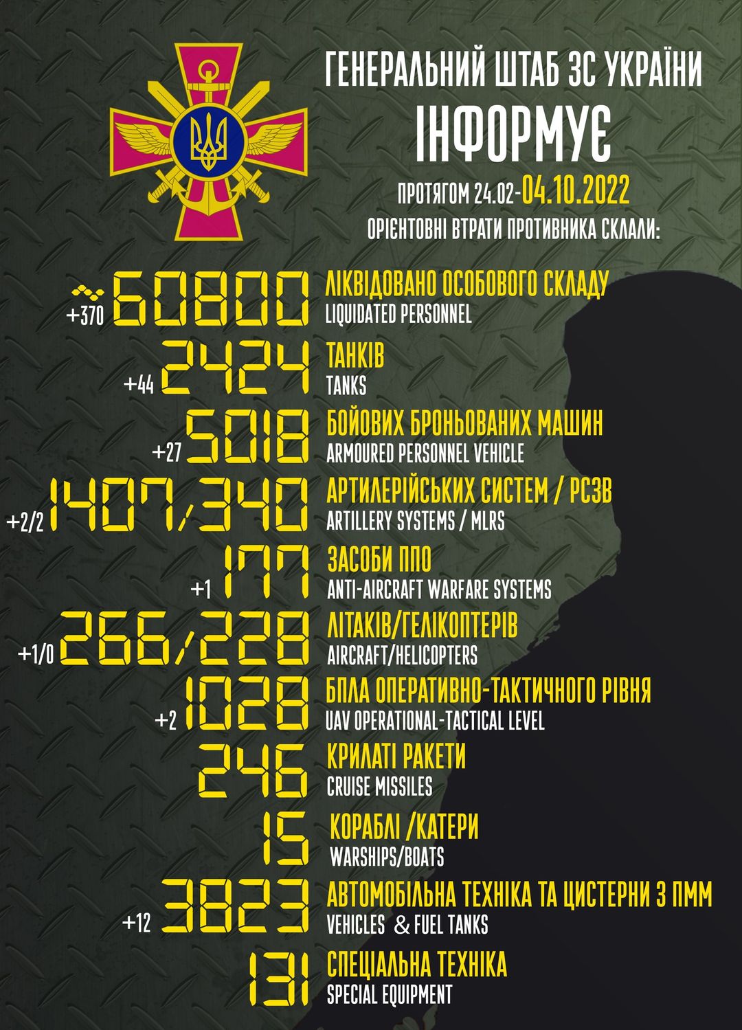 Об общих боевых потерях противника по состоянию на 4 октября сообщили в Генштабе ВСУ.