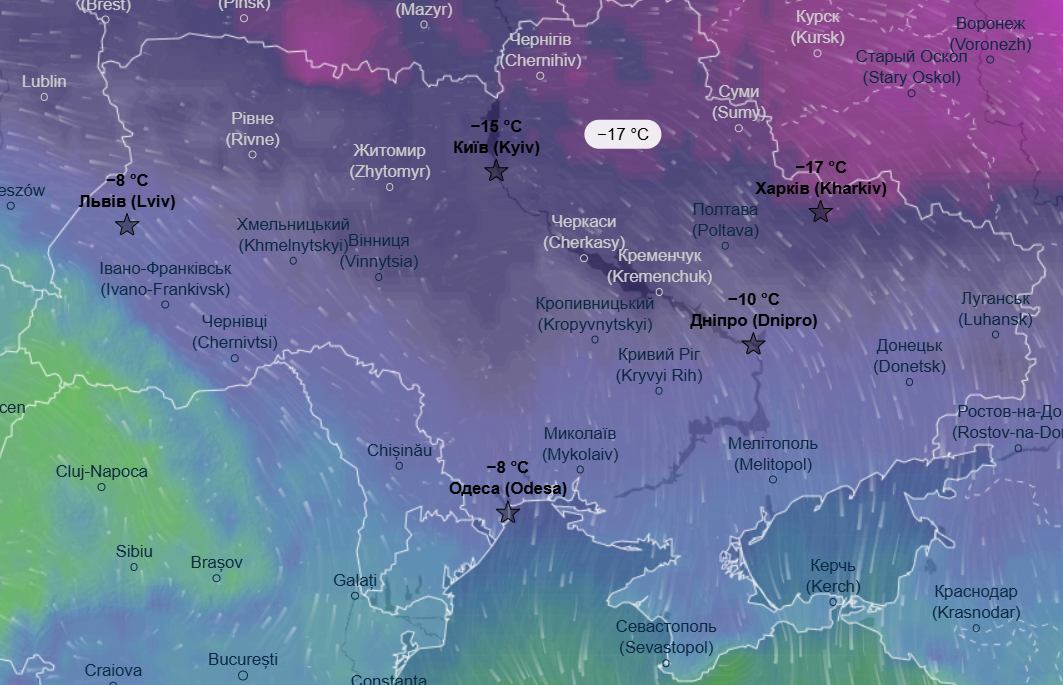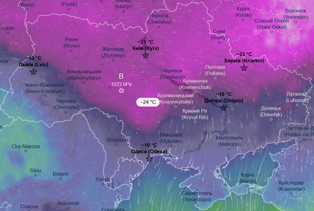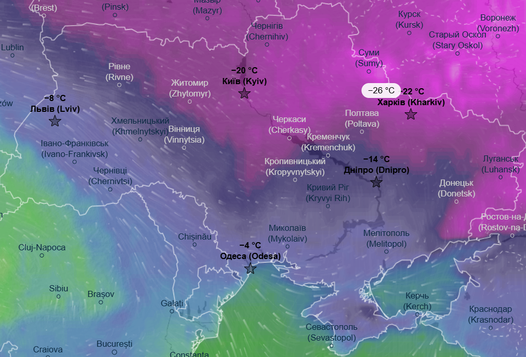 В ночь на среду, 4 февраля, больше всего заморозит северные, восточные и некоторые центральные области - накроют морозы в пределах -20...-24 °С, холоднее всего будет на Харьковщине и Сумщине, где ожидается до -26 °С.