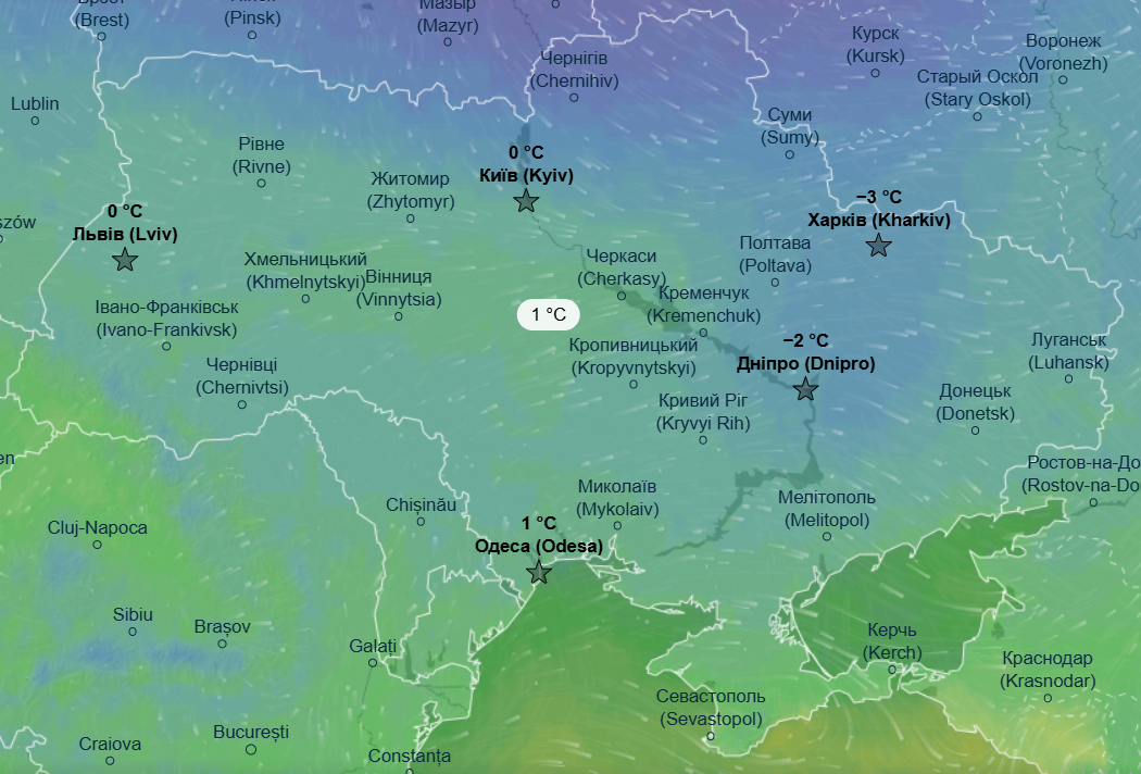 Днем в воскресенье небольшие морозы до -1...-4 °С снова накроют северные области Украины, а на остальной территории нашей страны удержится "плюсовая" температура с дневным максимумом в пределах +1...+3 °С.