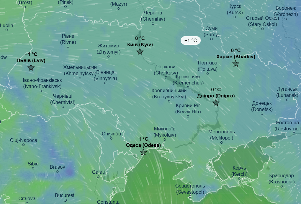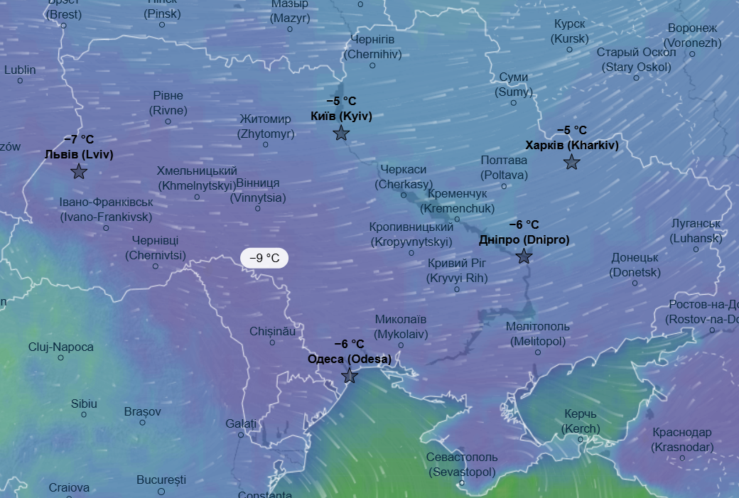 Как прогнозируют синоптики, в пятницу, 26 декабря, волна арктического воздуха, которая принесла в Украину морозы, начнет перемещаться с севера на юг и в западный регион: ночью еще прогнозируются морозы в пределах -6...-8 °С. Днем в этих регионах ожидается до -5 °С, а вот на севере нашей страны температура повысится до 0...+1 °С.
