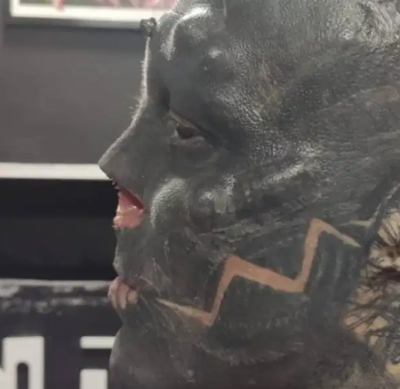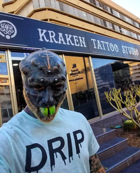 Кроме того, он осмелился сделать себе татуировку глазных яблок, хотя чернила могут ослепить, вставил кожные имплантаты в лицо, что придает его коже более рельефную текстуру. Теперь у него на лбу шишки, как у рептилий, и резкие линии на скулах.