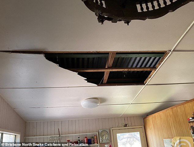 Житель австралийского города Лейси-Крик (штат Квинсленд) Дэвид Тейт обнаружил в своем доме двух огромных питонов, которые попали внутрь, проломив потолок.