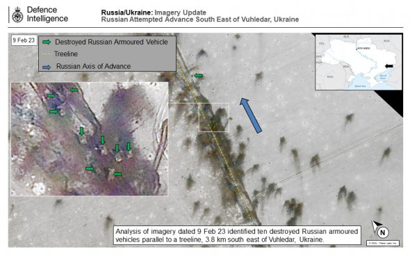 Минобороны Великобритании сообщает в Twitter, что возле Угледара уничтожены подразделения 155-й бригады российской морской пехоты, которые были на передовой последних наступательных операций в этом направлении. Морская пехота считается "элитным пехотным войском" ВС РФ. Британская разведка разместила соответствующее фото.