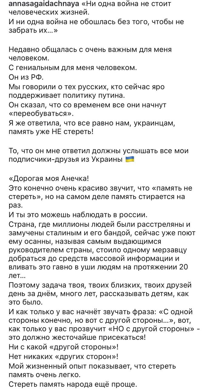 Об этом написала журналистка Алина Доротюк, напомнив пост украинской актрисы Анны Сагайдачной на ее Instagram-странице от 19 марта 2022 года.