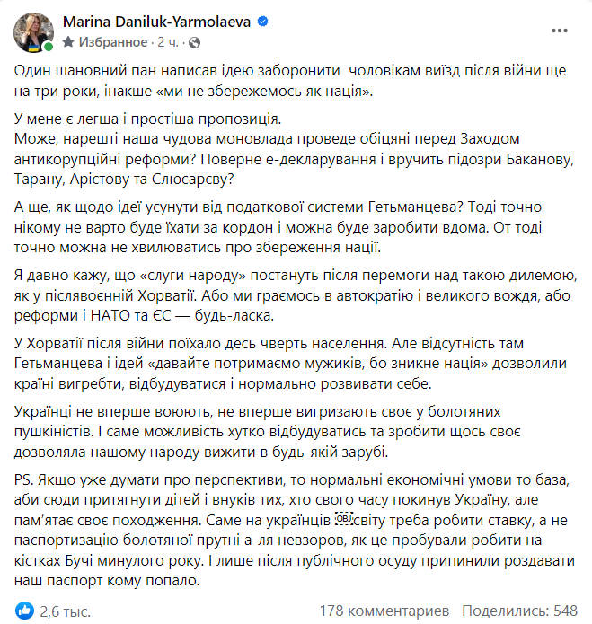 Блогер и журналист Марина Данилюк-Ярмолаева инициативе Денисенко посвятила отдельный пост и предложила властям сперва провести обещанные реформы, которых дожидаются союзники. Отдельно она призвала правоохранителей вручить подозрения народным депутатам и топ-чиновникам, которых обвиняют в незаконном пересечении границы и даже госизмене.