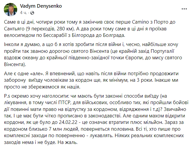 По его словам, граница после завершения войны должна быть "закрытой" для мужчин еще на протяжении трех лет.