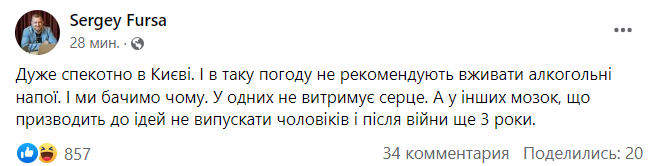 Финансовый аналитик и блогер Сергей Фурса потроллил Вадима Денисенко из-за такого предложения и предположил, что экс-советник главы МВД перегрелся на солнце в тот самый момент, когда в Киеве фиксируют аномальную жару.