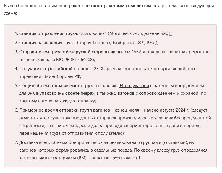 Указанные поставки боеприпасов на станцию Старая Торопа являются самыми масштабными по объему на данный момент за 2024 год, и самыми большими по вывозу боеприпасов со станции Осиповичи за этот же период.
