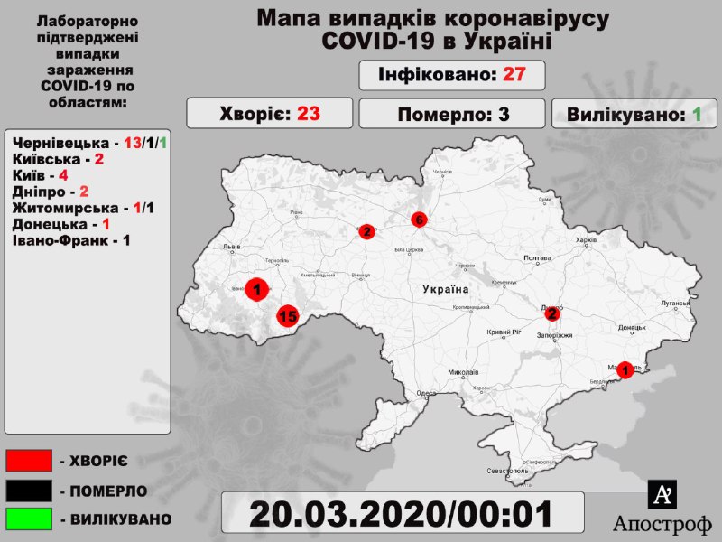 19 марта в стране подтвердились 11 диагнозов. Сейчас в Украине 27 лабораторно подтвержденных случаев COVID-19, 3 из них - летальные.