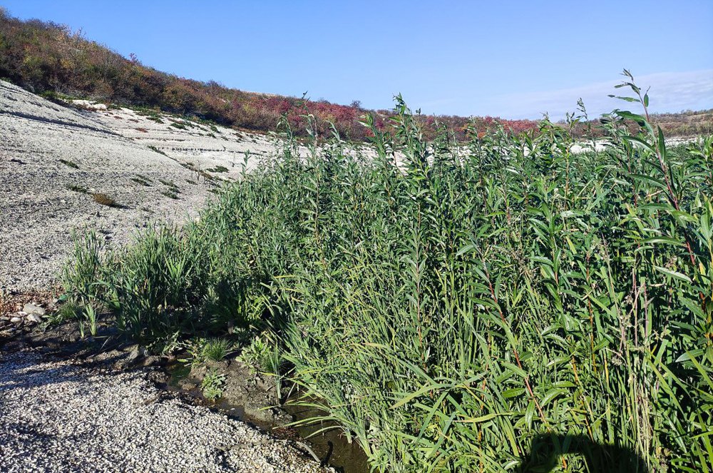 Среди зарослей ивы встречаются сеянцы как инвазионных видов, так и местных, характерных для таких водно-болотных территорий.