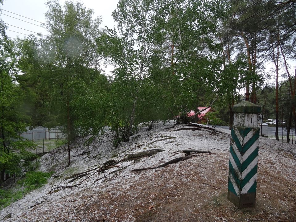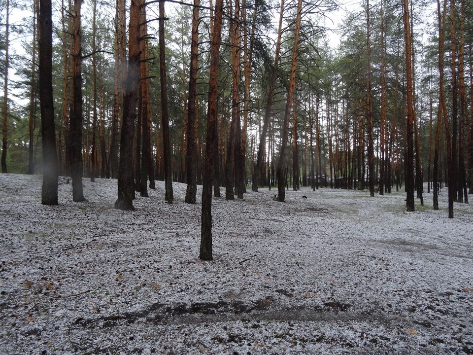 На снимках можно увидеть, что град был очень плотным, он буквально усеял землю в лесу. Пейзаж напоминает зимний.