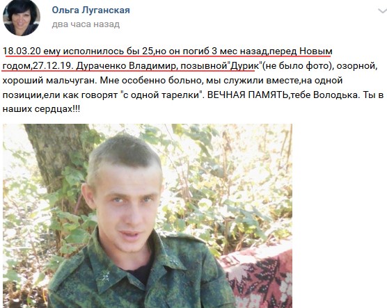 "Дураченко Владимир Юрьевич "Дурик" (Брянка, 18/03/95) погиб 27/12/19 (обстоятельства требуют уточнения)", - отметил он.