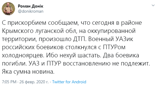 "Два боевика погибли. УАЗ и ПТУР восстановлению не подлежит", – пишет Доник.