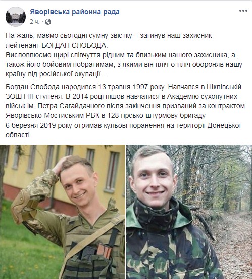 В зоне проведения операции Объединенных сил на Донбассе погиб 21-летний лейтенант Богдан Слобода из Новояворивска.