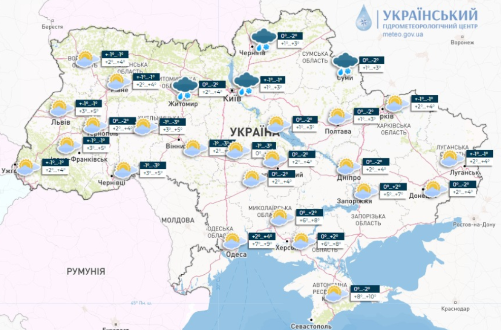 "Температура ночью от 1° тепла до 4° мороза, днем 0-5° тепла, в южных областях 4-9°", - говорится в сообщении Укргидрометцентра.
