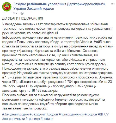 Сообщается, что в частности, из ППр "Шегини" за сутки пропущено 2784 транспортных средства и 23 387 человек, из ППр "Краковец" проследовало 3366 единиц автотранспорта и 16165 пассажиров.