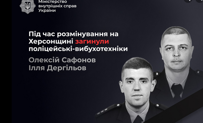 Речь идет о двух работниках управления взрывотехнической службы Нацполиции в Запорожской области - старшем лейтенанте Алексее Сафонове и лейтенанте Илье Дергилеве.