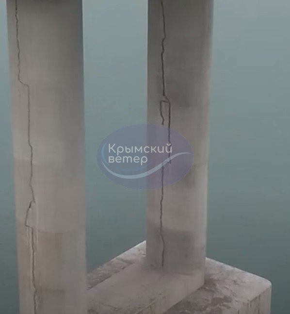 Об этом пишет канал Крымский ветер, опубликовавший кадры двух треснувших опор моста через Керченский пролив.