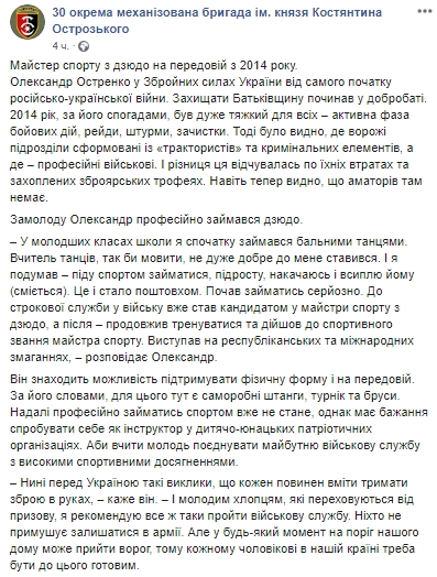 Его историю опубликовали на Facebook-странице 30-й отдельной механизированной бригады им. князя Константина Острожского.