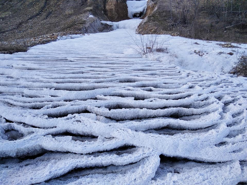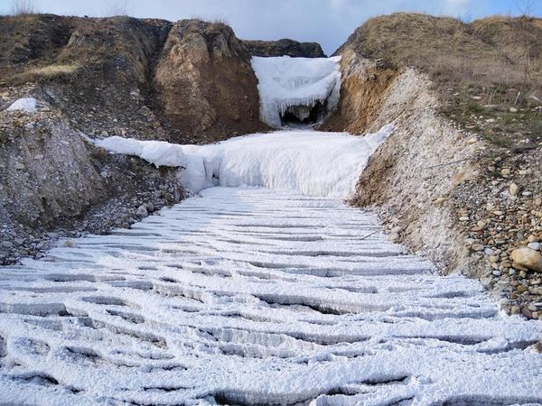 Как сообщил изданию "Курс" заместитель директора НИИ "Галургии" Юрий Садовой, на месте вытока из карьера рассолов образуется мирабилит - десятиводний сульфат натрия (Na2SO4 10H2O), который застывает при температуре +8 и ниже.