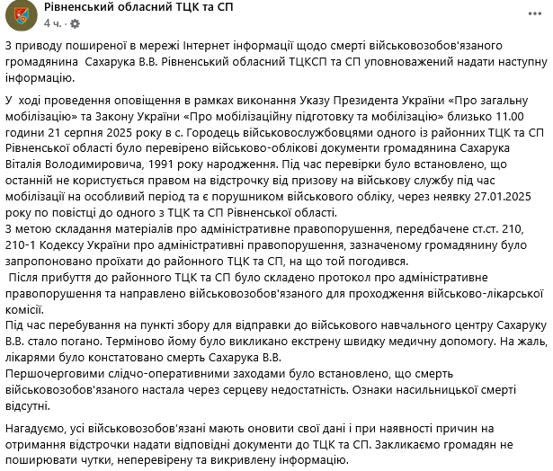 Об этом говорится в сообщении Ровенского областного ТЦК в Facebook.