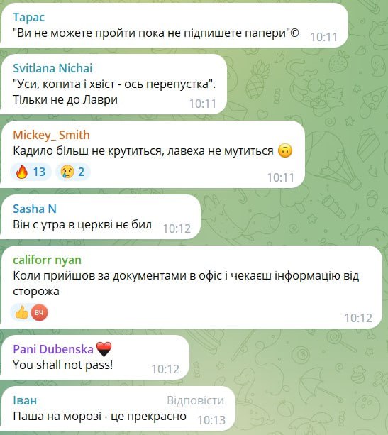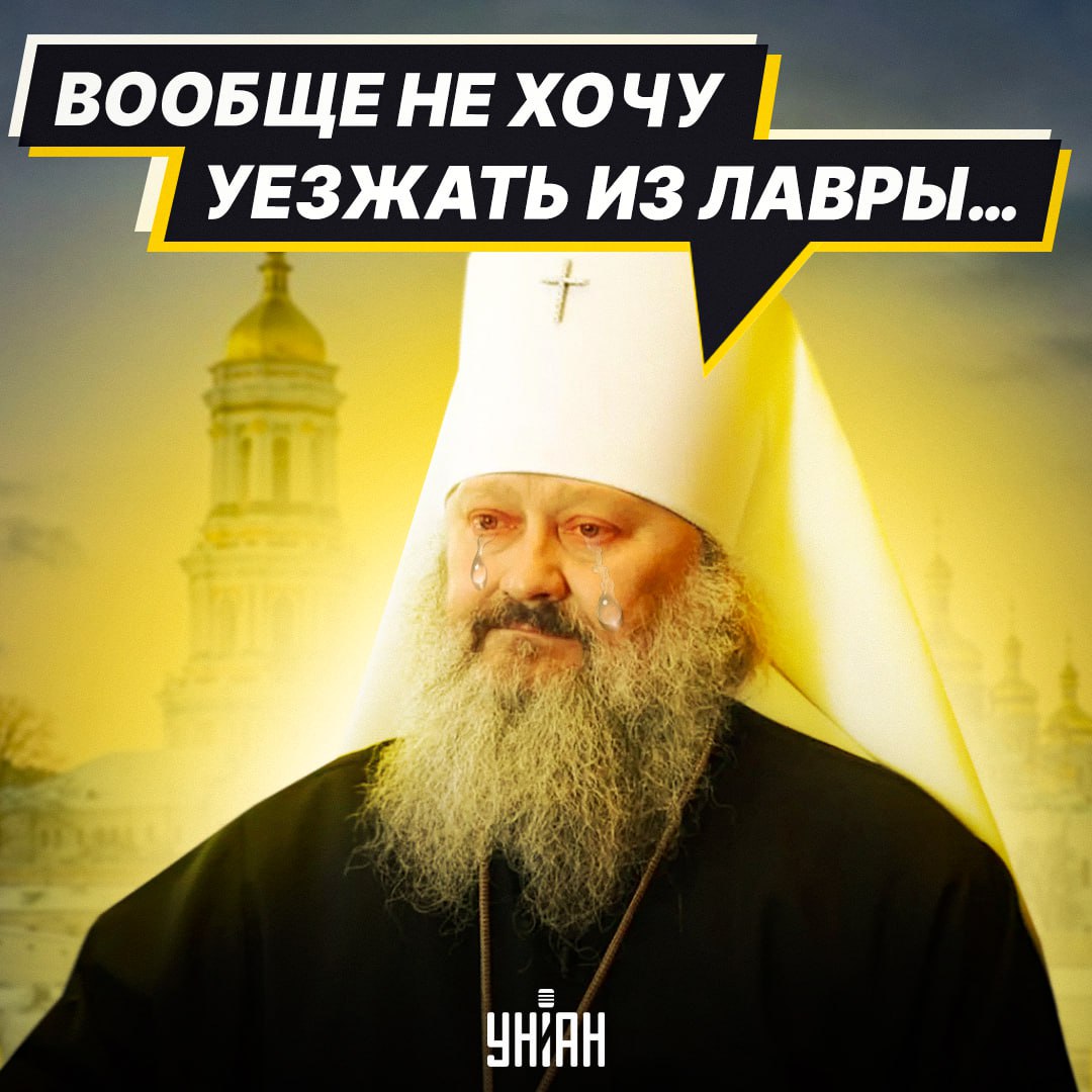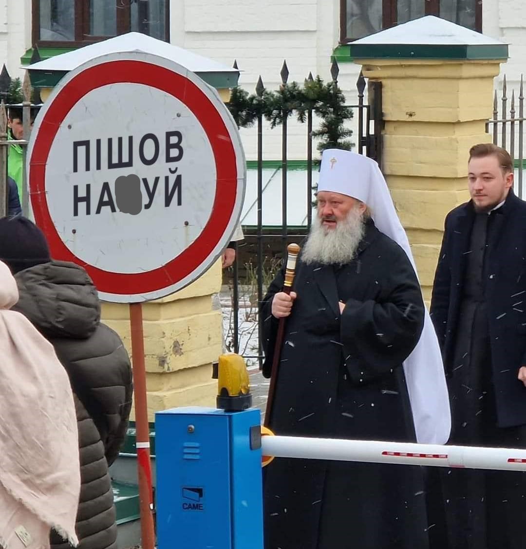 Митрополит Павел, известный в Украине как "Паша Мерседес" запечатлен в облачении перед шлагбаумом для пропуска людей на территорию Лавры рядом о знаком "Пред'явіть перепустку". Выражение его лица - растерянное.