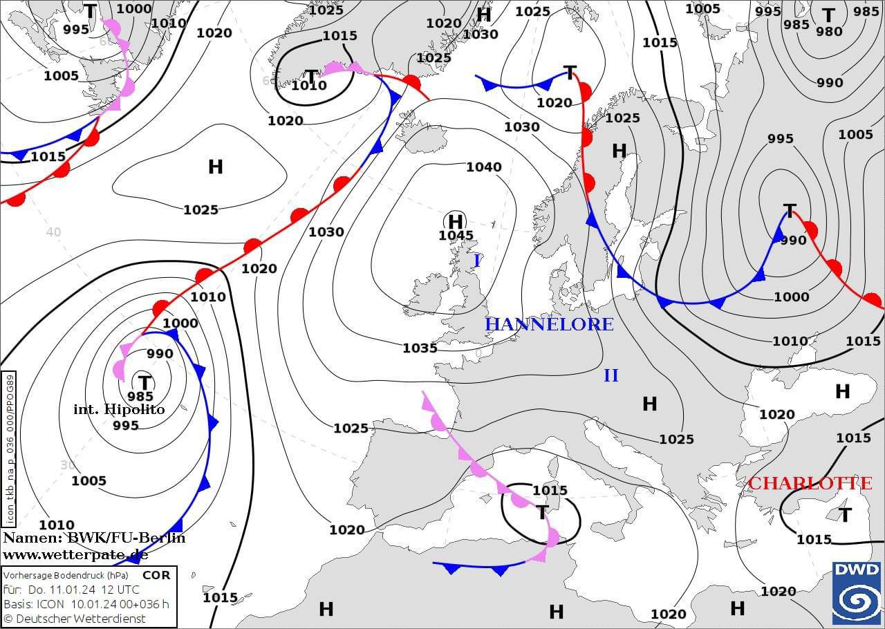 На синоптическую ситуацию в ближайшие дни будет влиять антициклон Hannelore, который сейчас держится над Великобританией и удерживает зону высокого атмосферного давления и сухой погоды на значительной части Европы. В свою очередь циклон с атмосферными фронтами на его периферии, на юге и северо-востоке обуславливают осадки на прилегающих территориях – дождь и снег.
