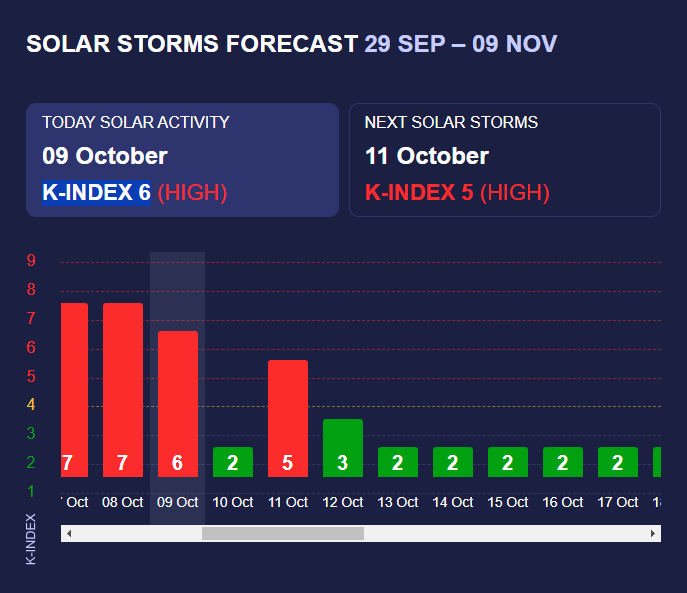 По прогнозу Meteoagent магнитная буря с K-индексом 6 ожидается на Земле в среду, 9 октября. Новое возмущение магнитного поля специалисты прогнозируют 11 октября – ударит магнитная буря с K-индексом 5.