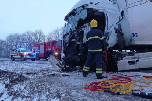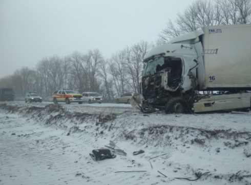 Утром 13 февраля произошло страшное ДТП на 553 км трассы Киев-Харьков-Довжанский, возле с. Коробочкино в Чугуевском районе с участием двух фур и автомобиля "Газель".