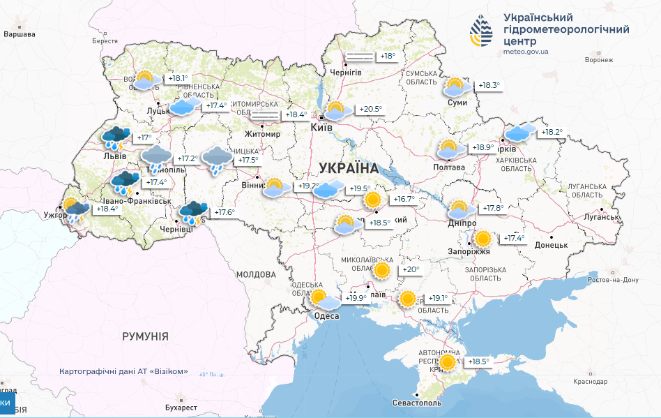 Ожидается, что днем по всей Украине, кроме Волынской, Луганской, Донецкой и южных областей, пройдут кратковременные дожди, грозы. В отдельных районах Черновицкой, Хмельницкой, Винницкой, Черкасской и Черниговской областей ожидаются град и шквалы 15-20 м/с; в Закарпатской, Ивано-Франковской и Черновицкой областях на протяжении суток сильные дожди.